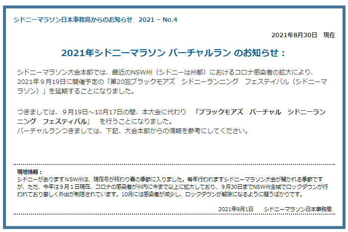 この中に、シドニーマラソン日本事務局からの公式アナウンスがあります。